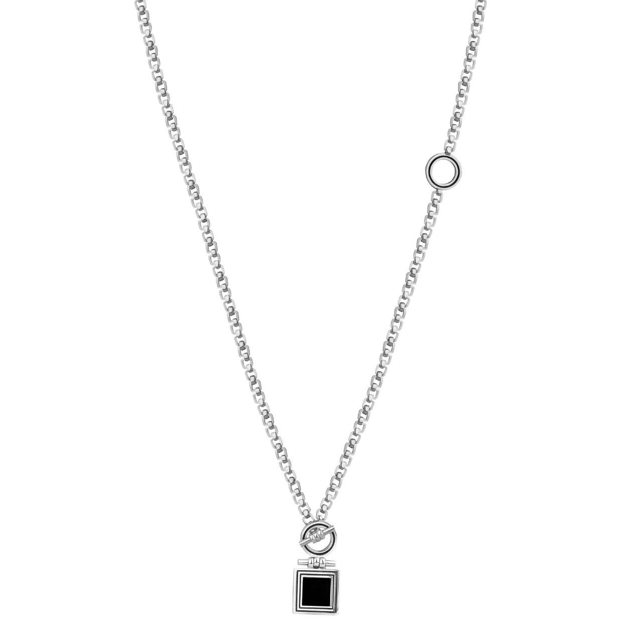 • Material: Sterling silver with oxide finish • Details: Black stone, antique charm • Design: Double-sided for two distinct styling options • Length: 75cm The Elham Silver Long Necklace offers timeless versatility with its intricate double-sided design, allowing it to be worn in two unique ways. Adorned with a sleek black stone and finished with an oxidized texture, this necklace seamlessly blends classic and contemporary elements, making it perfect for him or her.