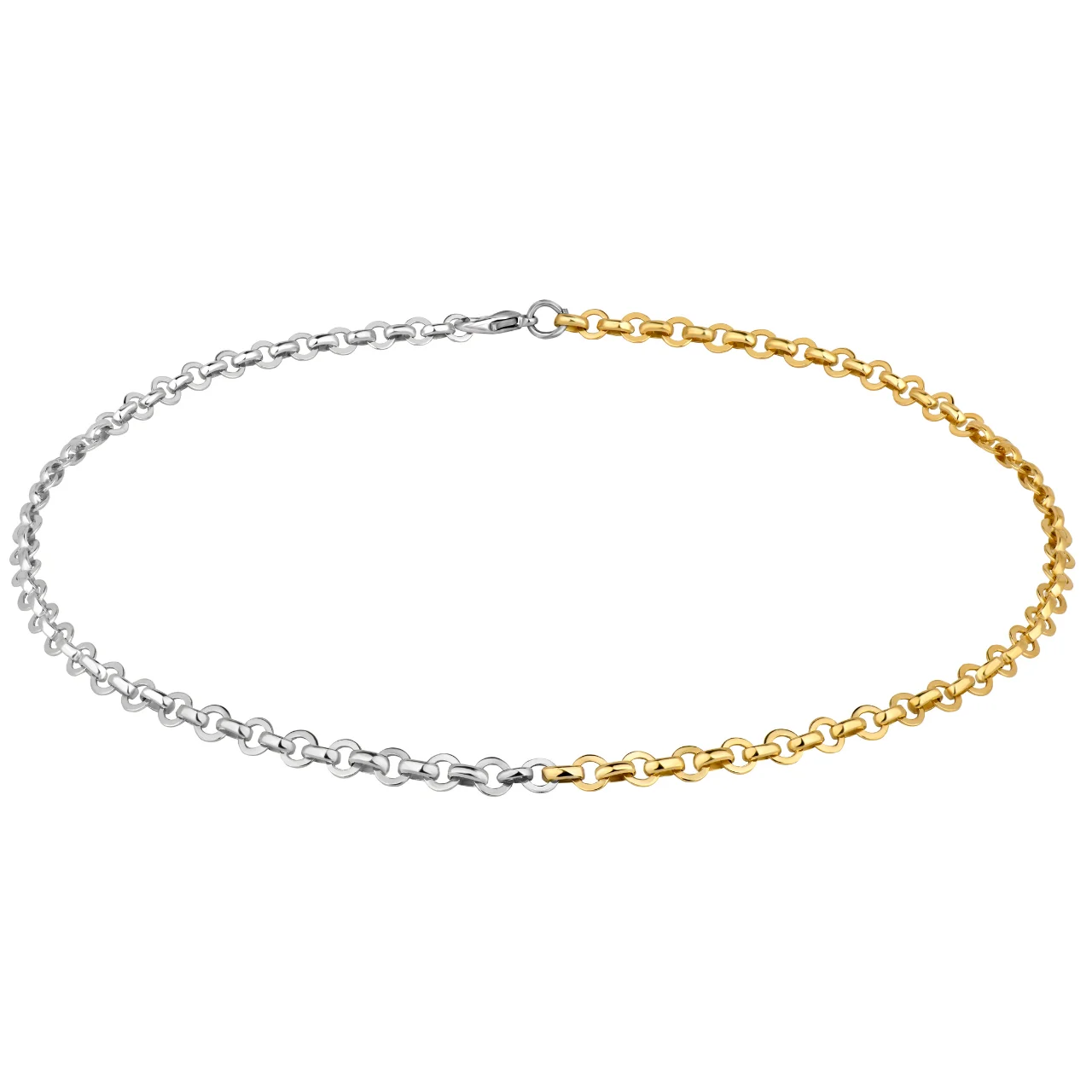 The Zeena Half-and-Half Choker is a bold statement piece that seamlessly combines the warmth of 18k gold with the cool elegance of platinum-plated silver. Its unique dual-tone design and modern silhouette make it a standout accessory for any occasion.