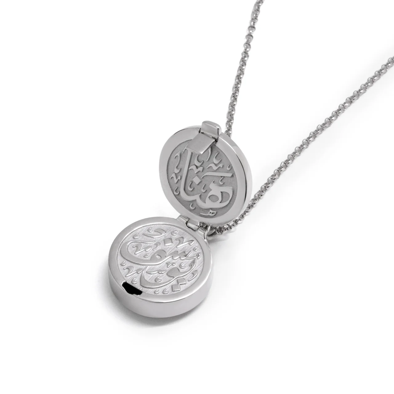 Material: Pure silver with platinum plate Enhance your day-to-day fashion with our Zeena Collection’s Silver Locket. Drawing inspiration from Arabic artistry, this exquisite item brings a dash of sophistication to your daily life. Keep your treasured memories near with this finely crafted locket. Notes: Customizable calligraphy and length is 45cm Up to 2 Names or Pictures could be added